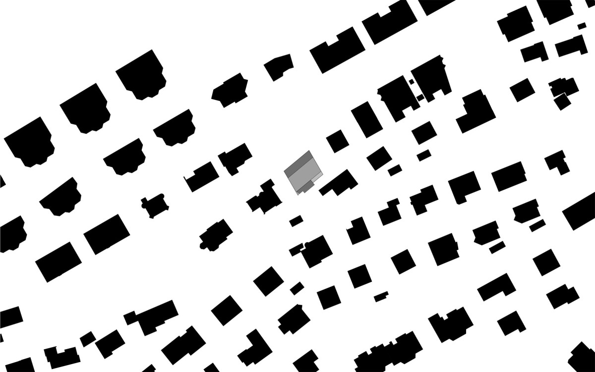 Die Geometrie des Gebäudes wird stark durch die Grundstücksform, sowie durch die Lage der Erschliessung geprägt. So auch die unkonventionelle Dachform, welche sich mit seiner Form in die Umgebung eingliedert.