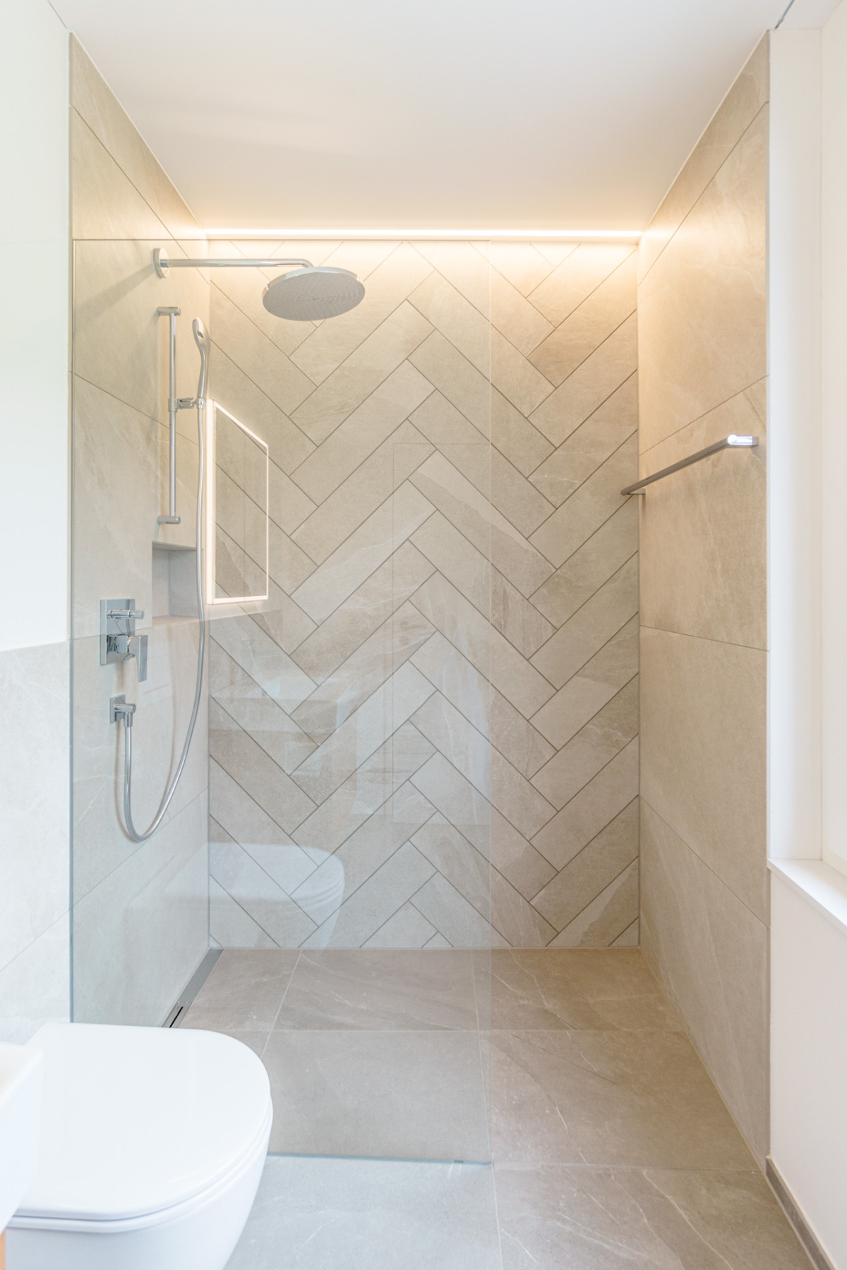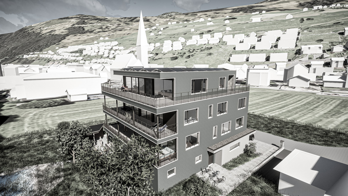 Die schlichte, kubische Bauform integriert die Terrassen in das Gebäudvolumen, welche eine nahtlose Verbindung zwischen Innen- und Aussenraum herstellen, ohne die klaren Linien des Gebäudes zu unterbrechen.