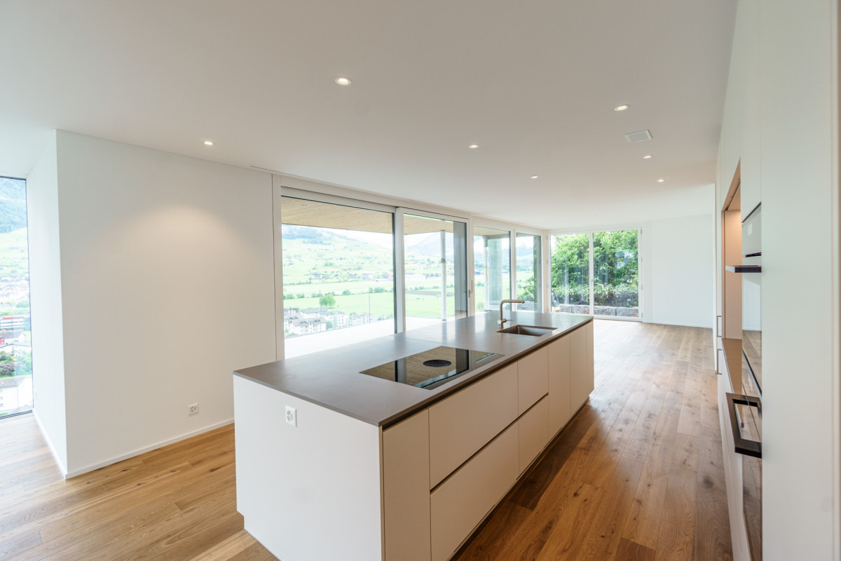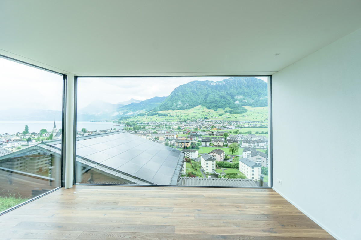 Die Geometrie des Gebäudes wird stark durch die Grundstücksform, sowie durch die Lage der Erschliessung geprägt. So auch die unkonventionelle Dachform, welche sich mit seiner Form in die Umgebung eingliedert.